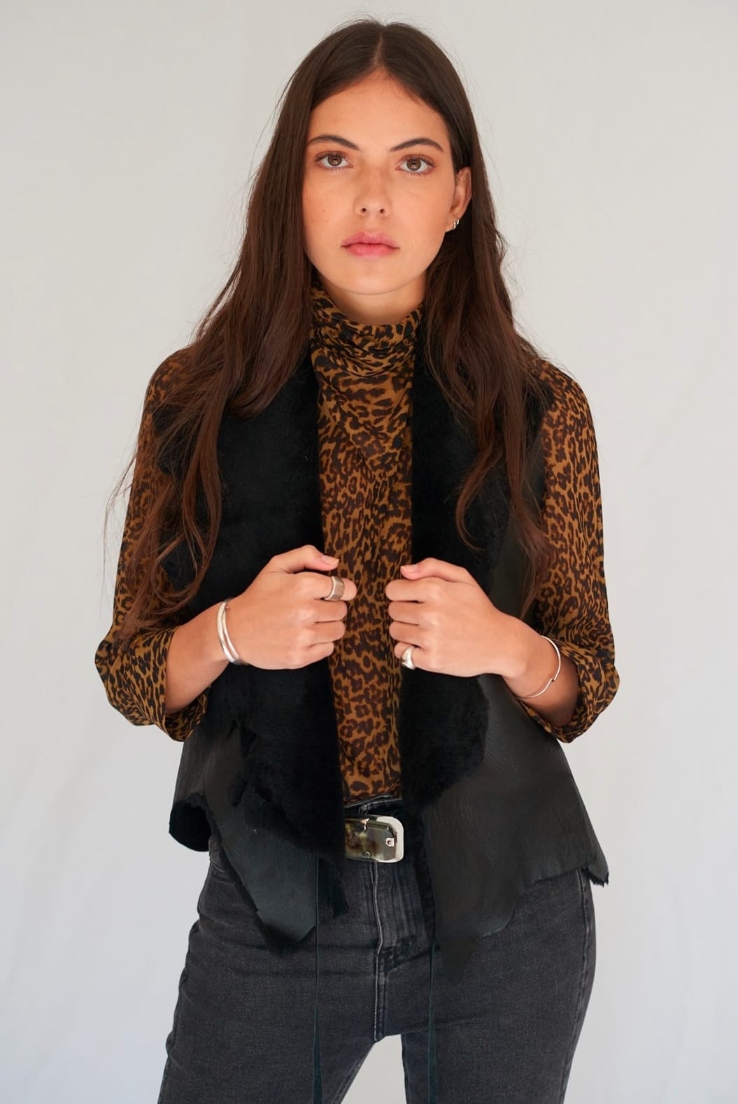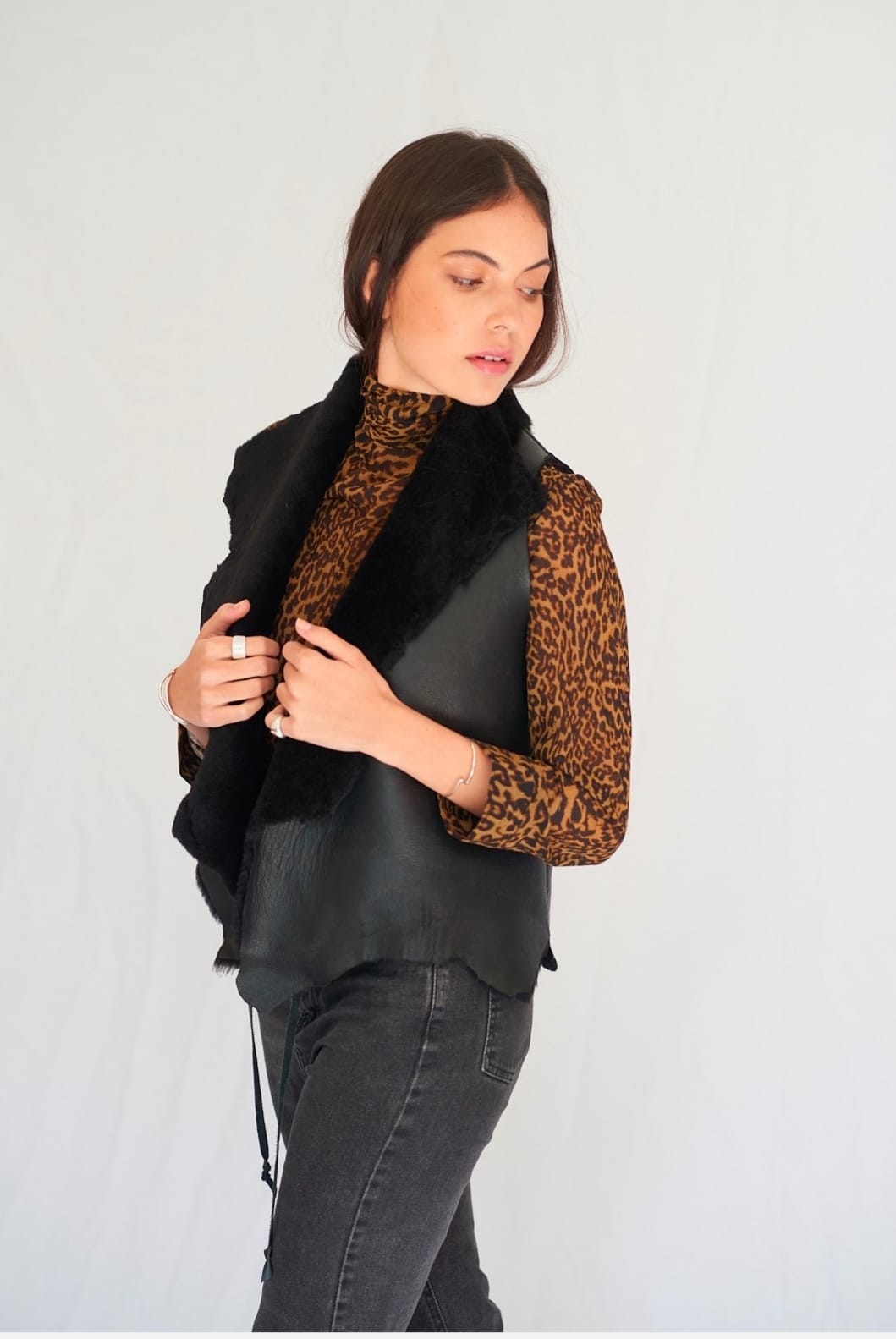 Chaleco sin mangas de cuero, con lana en su interior muy abrigado para este invierno. Se cierra por uno de sus costados y tiene terminaciones asimétricas.