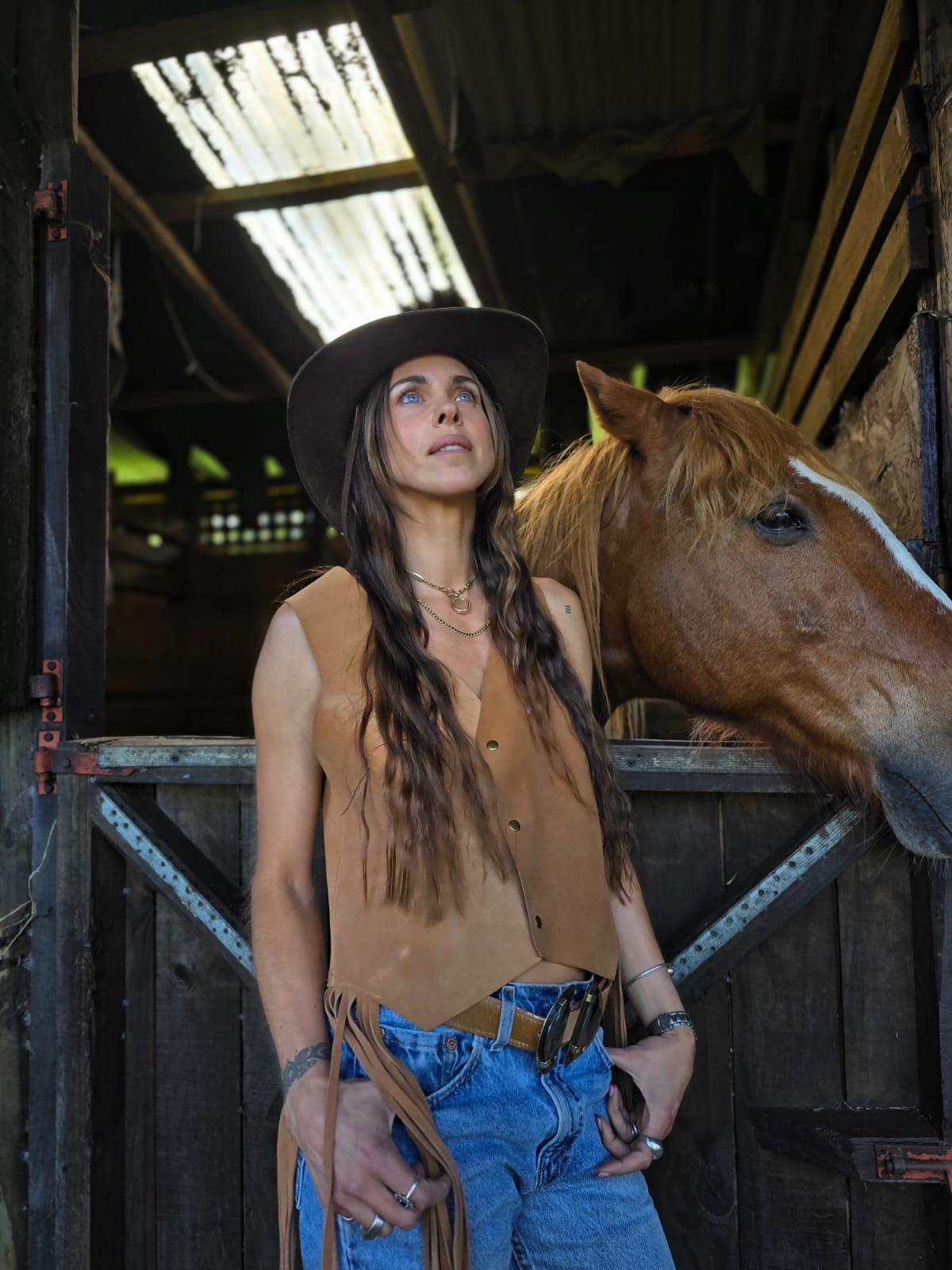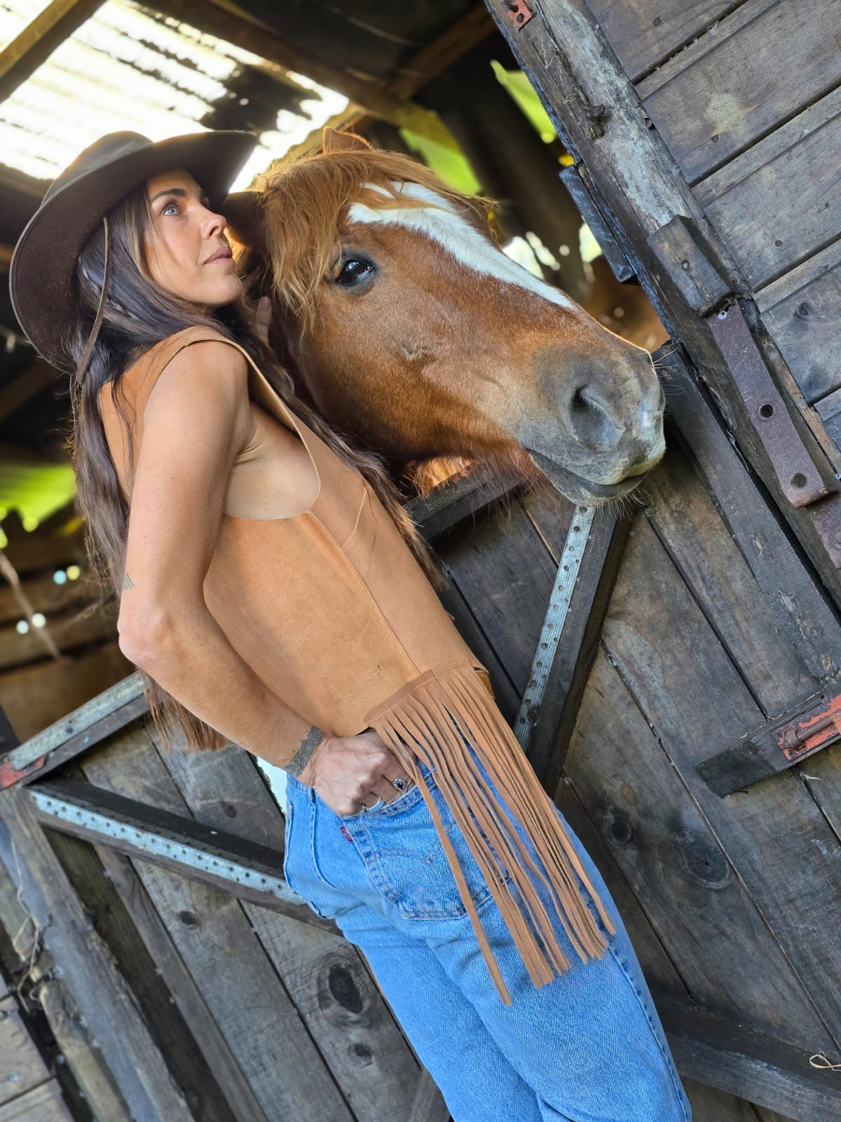 Chaleco de gamuza, estilo sastrero, con flecos en los costados. Totalmente versátil puedes usarlo como Top o como Chaleco.