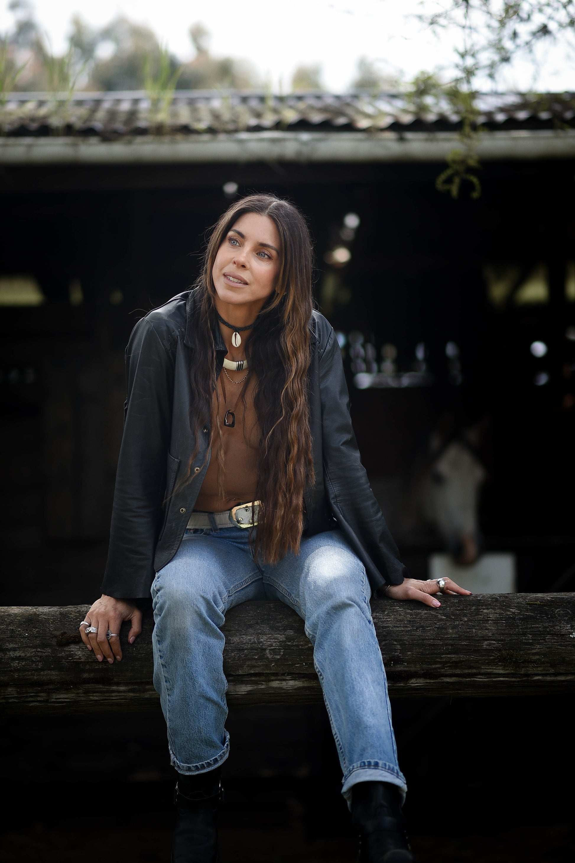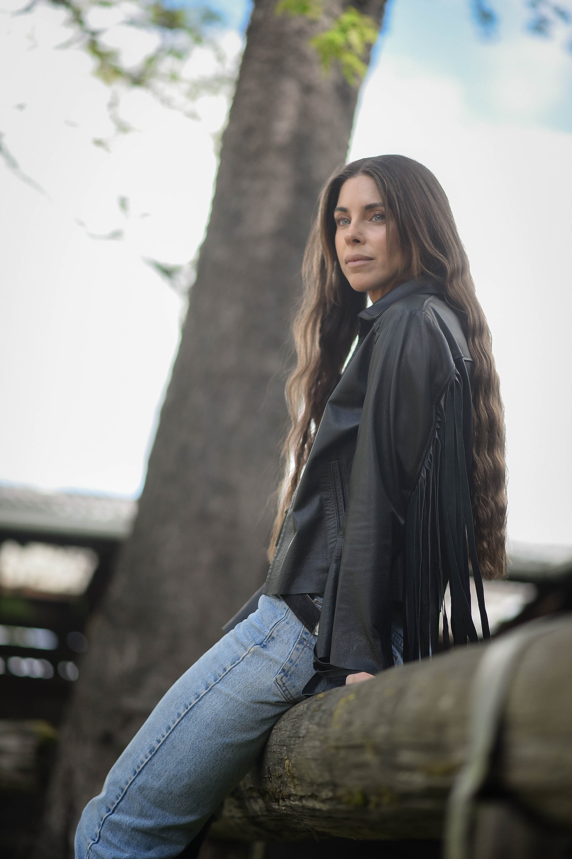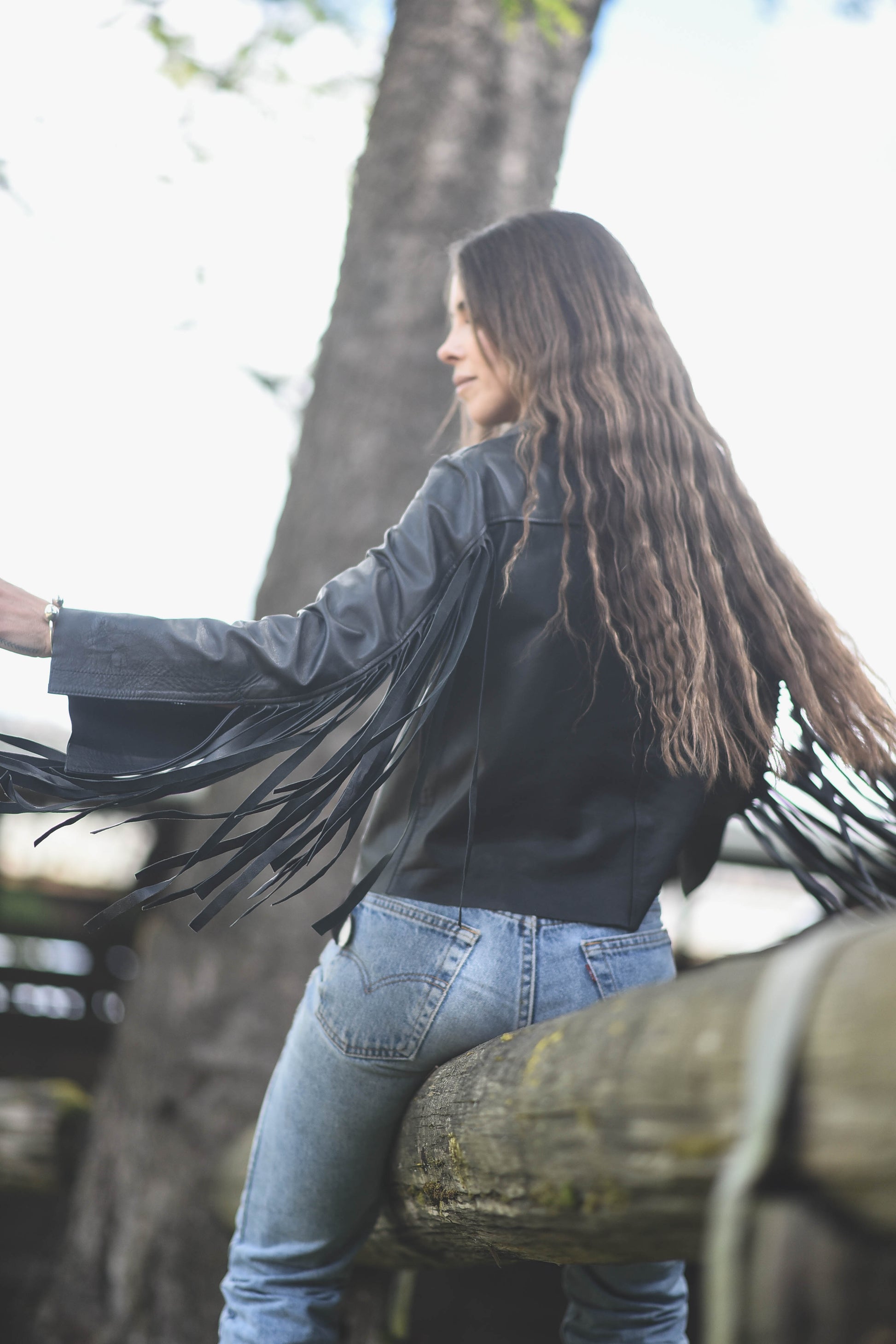 Chaqueta de cuero, con flecos en las mangas que le da movimiento a la prenda. Detalle de costuras visibles en cuero a la altura del hombro.