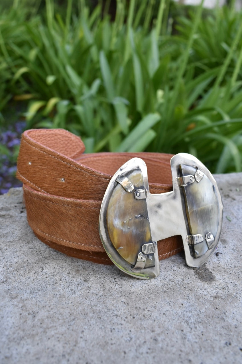 Cinturón de cuero, textura pelo Caramelo con hebilla XL de Alpaca y Asta